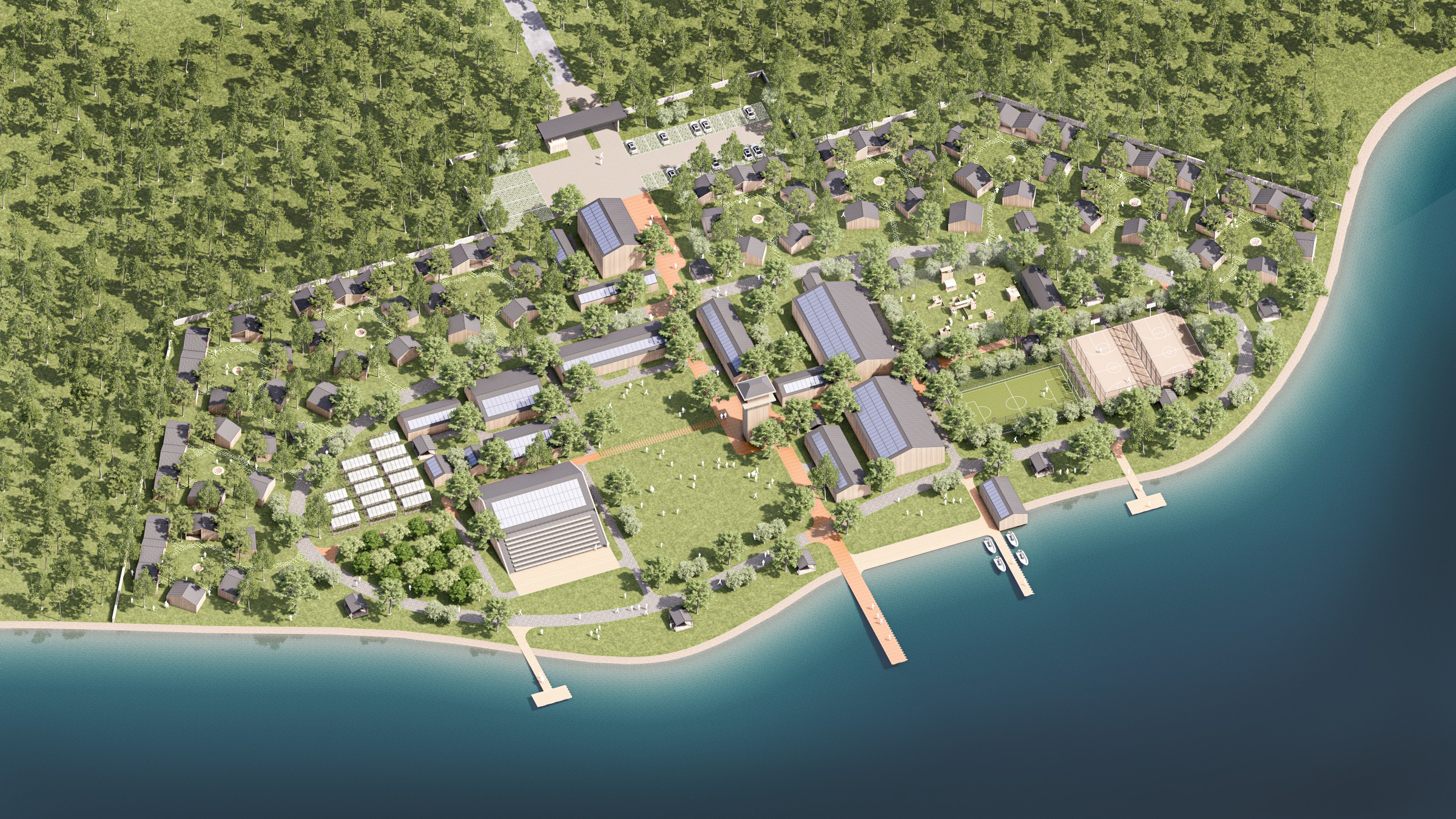 Göl kenarında ve ormanlık arazide kurgulanan projemiz, dairesel yerleşimli ahşap konaklama üniteleri, çok amaçlı amfitiyatro, hidrokültür seraları, paintball alanı ve çeşitli spor sahalarıyla zengin bir yaşam sunmaktadır. Sürdürülebilirlik odaklı tasarımıyla güneş enerjisinden faydalanan, doğal malzemeleri öne çıkaran ve çevre bilincini teşvik eden kampımız, gençlerin hem fiziksel gelişimini desteklemeyi hem de doğa ile uyum içinde öğrenmelerini sağlamayı hedeflemektedir.